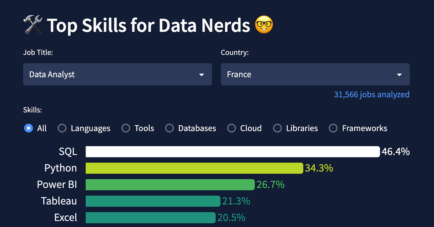 Le site https://datanerd.tech/, créé par le Youtuber Luke Barousse, analyse des dizaines de milliers d’offres d'emploi à travers le monde. Le résultat montre que près de 50% des postes de Data Analyst en France exigent la maîtrise du SQL. Cela place le SQL au rang numéro 1 des compétences essentielles pour Data Analyst.